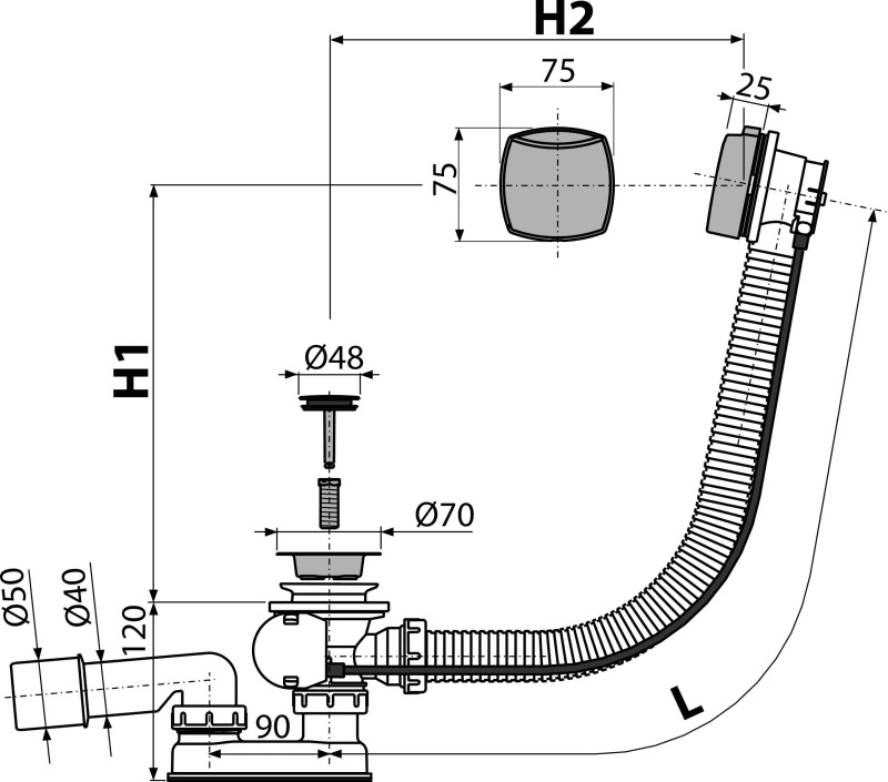 Alca automata kádszifon a víz elfolyásához kádból a szennycsatornába. Szabványos méretű kádakhoz O52 mm - es kimeneti nyílással A csomag tartalma: Szifon túlfolyóval, Krómozott műanyag forgató gomb, Krómozott fém dugó, Krómozott sárgaréz leeresztő rács, A bűzzár polipropilénből, ellenáll a hőnek és vegyszereknek, hosszirányban hegesztett, Szerelő készlet, Alakos tömítés
