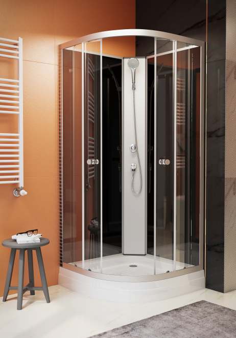 Negyedköríves zuhanykabin tálcával 90x90x200cm Üvegszál erősítéses, acél merevítésű, fehér színű, alacsony, akril zuhanytálca, állítható fém lábakkal. Matt króm ívek és profilok. 4 mm vastag, víztiszta biztonsági üvegek és ajtók. Fekete üveg hátfalak. Matt króm funkciós panel. Kézi zuhany. Kerámia betétes keverőszelep. Mágneses ajtózár. Görgős ajtónyitás. Leeresztő szelep.
