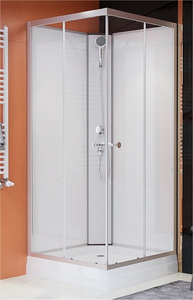 Szögletes zuhanykabin tálcával 80x80x200cm Üvegszál erősítéses, acél merevítésű, fehér színű, alacsony, akril zuhanytálca, állítható fém lábakkal. Matt króm ívek és profilok. 4mm vastag, víztiszta biztonsági üvegek és ajtók Fehér üveg hátfalak. Matt króm funkciós panel. Kézi zuhany. Kerámia betétes keverőszelep. Mágneses ajtózár. Görgős ajtónyitás. Leeresztő szelep.