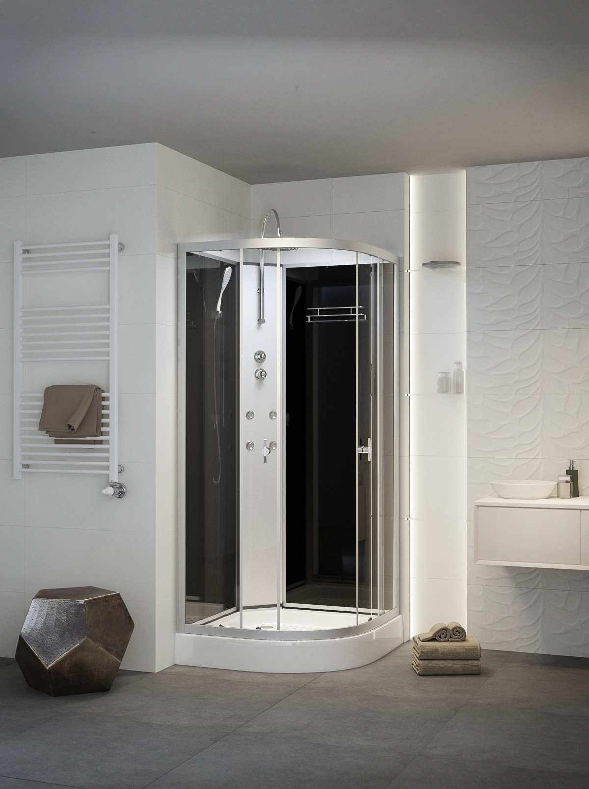 Negyedkörívés hidromasszázs zuhanykabin 90x90x222cm Üvegszál erősítéses, acél merevítésű, fehér színű, alacsony, akril zuhanytálca, állítható fém lábakkal. Matt króm alumíniumívek és profilok. 5 mm vastag, víztiszta biztonsági üvegek és ajtók. Fekete színű üveg hátfalak. Matt króm funkciós panel. 4 db hidromasszázs fúvóka. Kézi zuhany. Felső esőztető zuhany. Kerámia betétes keverőszelep és funkció váltó. Piperepolc. Mágneses ajtózár. Görgős ajtónyitás. Leeresztő szelep.