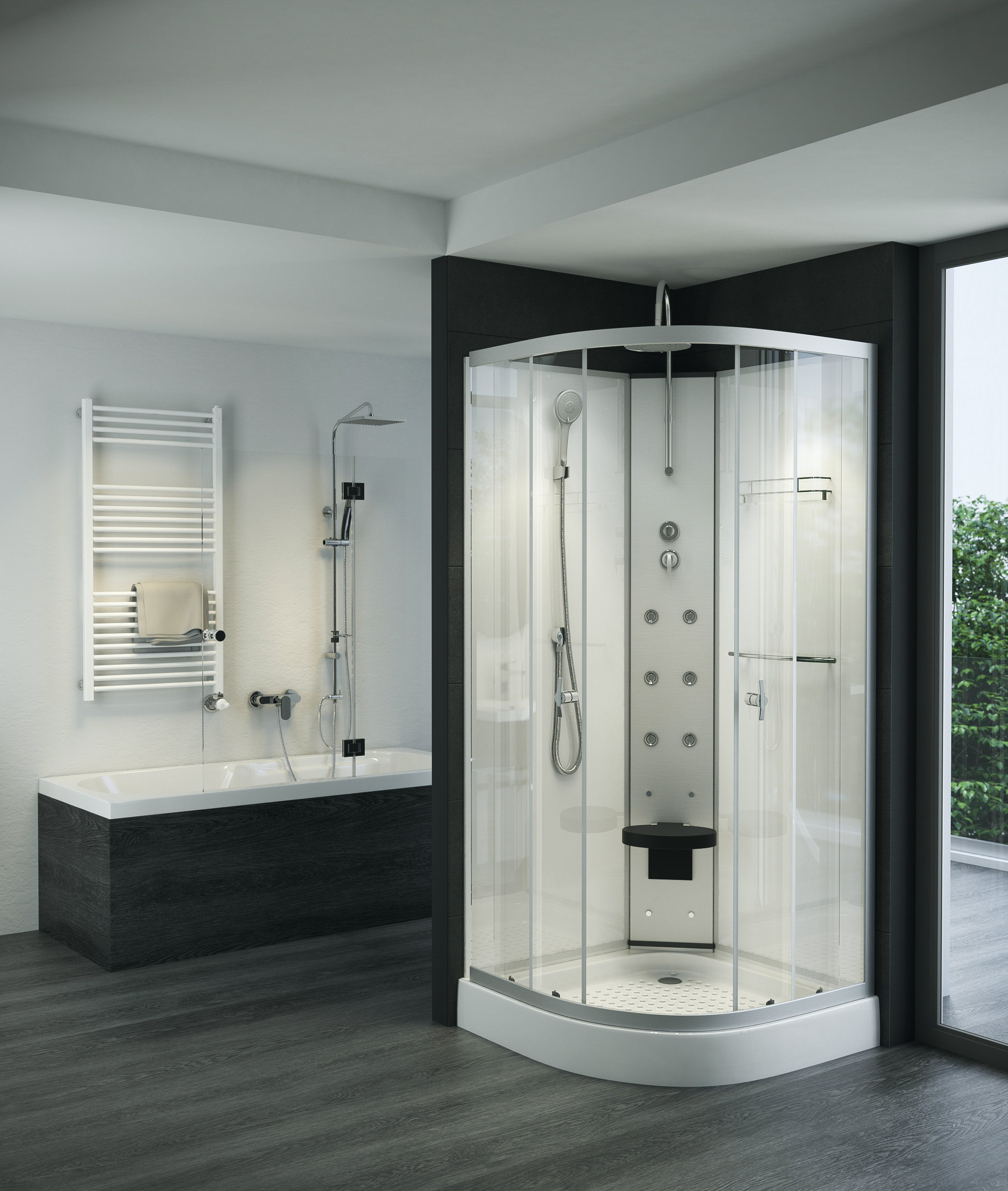 Negyedkörívés hidromasszázs zuhanykabin 90x90x230cm Üvegszál erősítéses, acél merevítésű, fehér színű, alacsony, akril zuhanytálca, állítható fém lábakkal. Matt króm alumíniumívek és profilok. 5 mm vastag, víztiszta biztonsági üvegek és ajtók. Fehér üveg hátfalak. Matt króm funkciós panel. 6 db hidromasszázs fúvóka. Kézi zuhany. Felső esőztető zuhany. Felhajtható ülőke. Kerámia betétes keverőszelep és funkció váltó. Piperepolc. Törölköző tartó. Mágneses ajtózár. Görgős ajtónyitás. Leeresztő szelep.