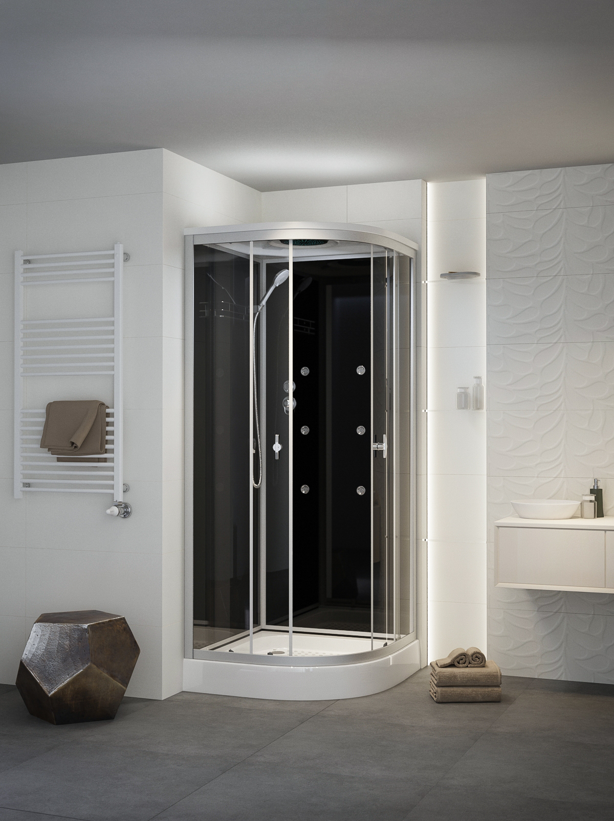 Negyedköríves hidromasszázs zuhanykabin 90x90x222cm Üvegszál erősítéses, acél merevítésű, fehér színű, alacsony, akril zuhanytálca, állítható fém lábakkal. Matt króm alumíniumívek és profilok. 4 mm vastag víztiszta biztonsági üvegek és ajtók. Fekete üveg hátfalak. 6 db hidromasszázs fúvóka. Kézi zuhany. Felső esőztető zuhany. Kerámia betétes keverőszelep és funkció váltó. Piperepolc. Mágneses ajtózár. Görgős ajtónyitás. Leeresztő szelep.