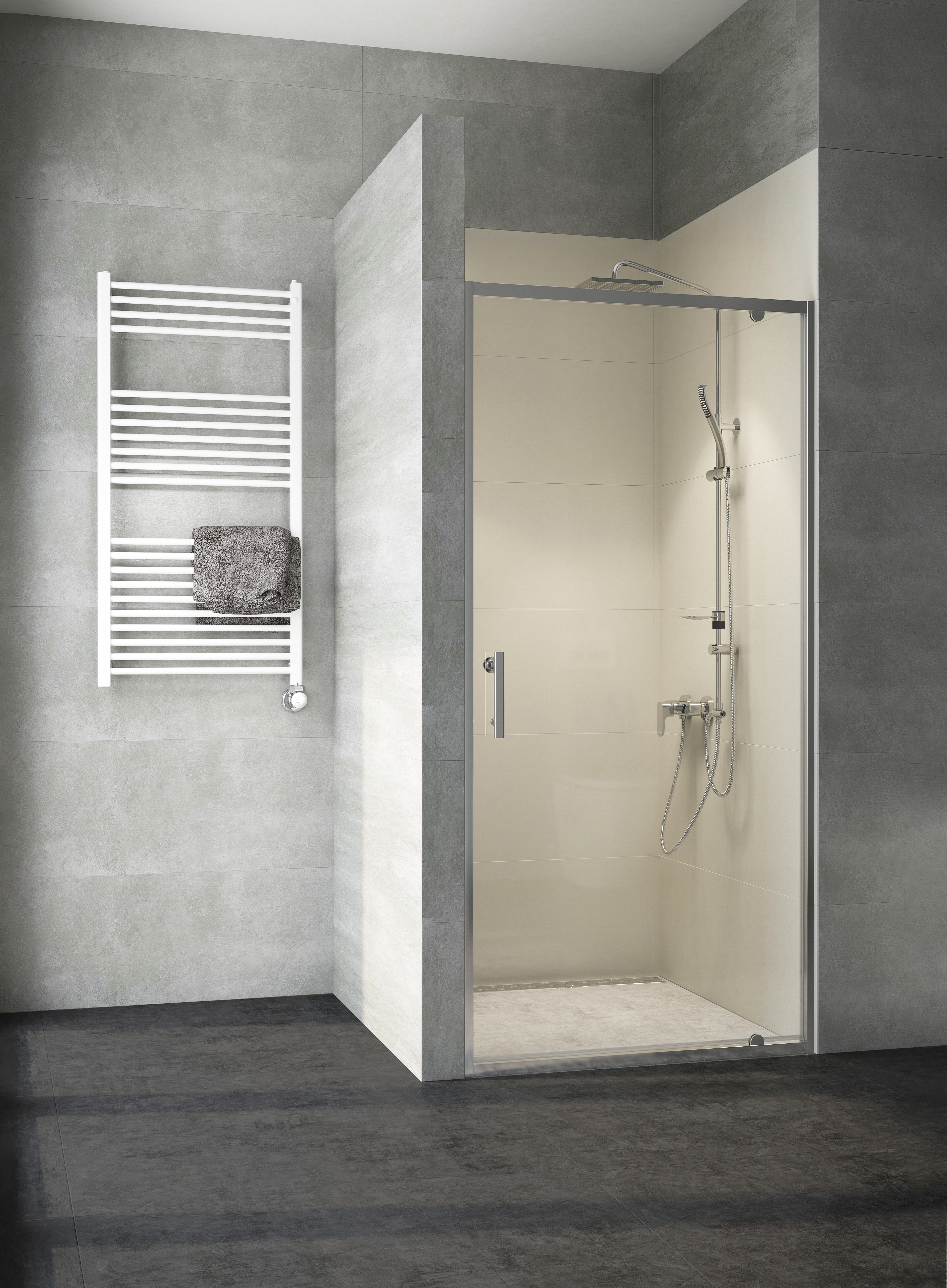 Zuhanykabin ajtó - 185 cm magas. Állítható szélesség 89-91 cm között. 5 mm vastag, víztiszta edzett biztonsági üveg. Krómozott fém zsanér. Polírozott alumínium profil. Jobbos-balos szerelhetőség. Krómozott fogantyú. Műanyag vízvető. Mágneses zár.