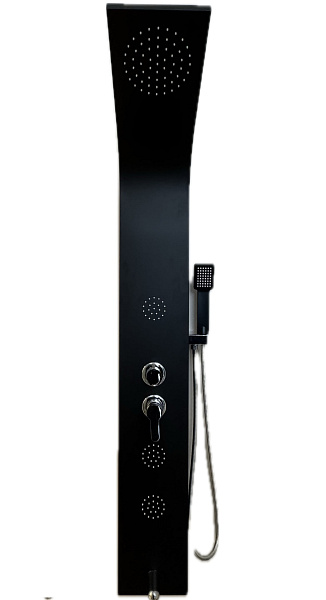 Hidromasszázs zuhanypanel 150x22 cm Fekete-króm színű alumínium zuhanypanel 3 db kör alakú fix hidromasszázs fúvóka Kerámia betétes keverőszelep és funkcióváltó Kézi zuhany Felső fix esőztető zuhany Kádtöltő funkció