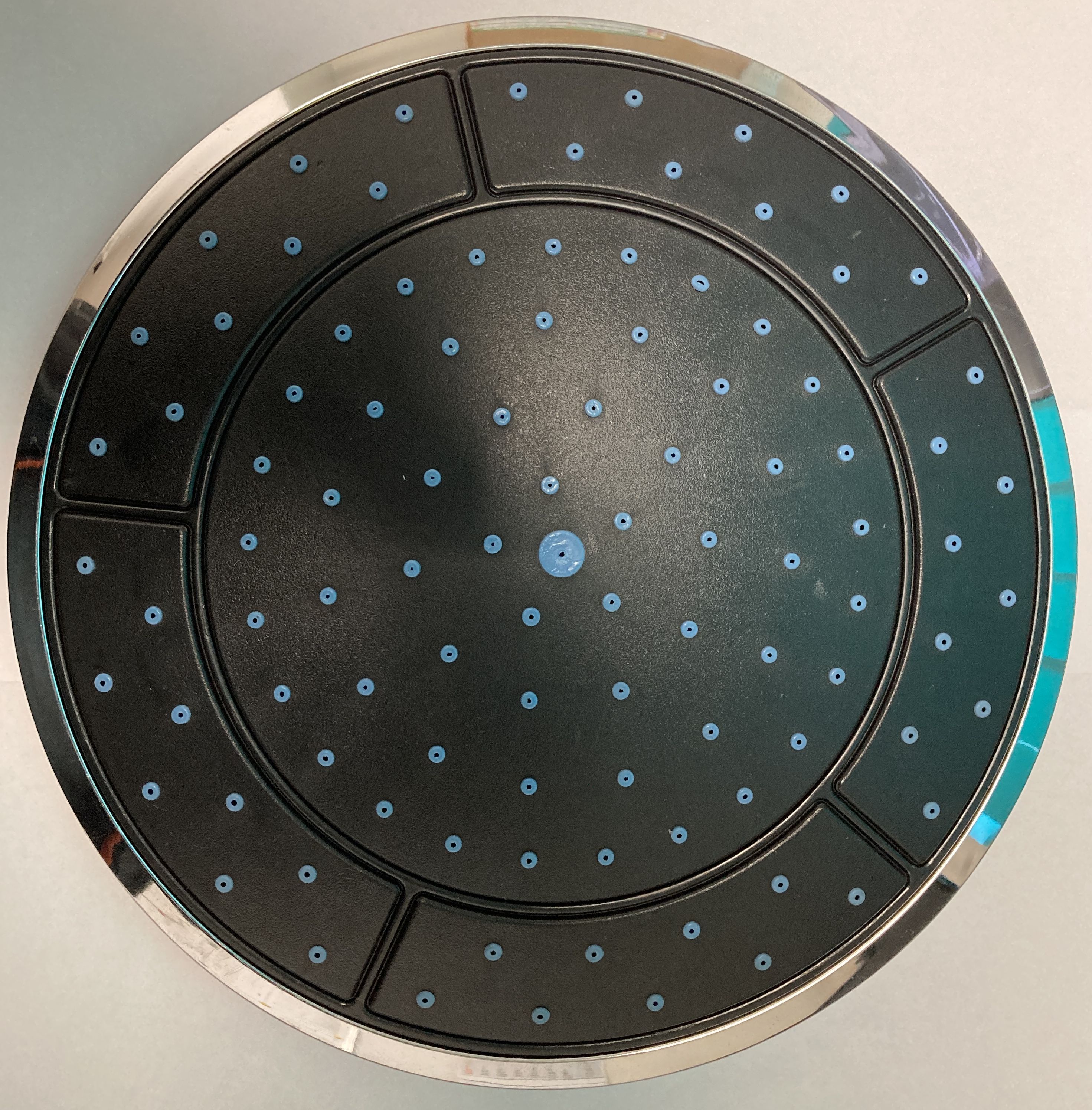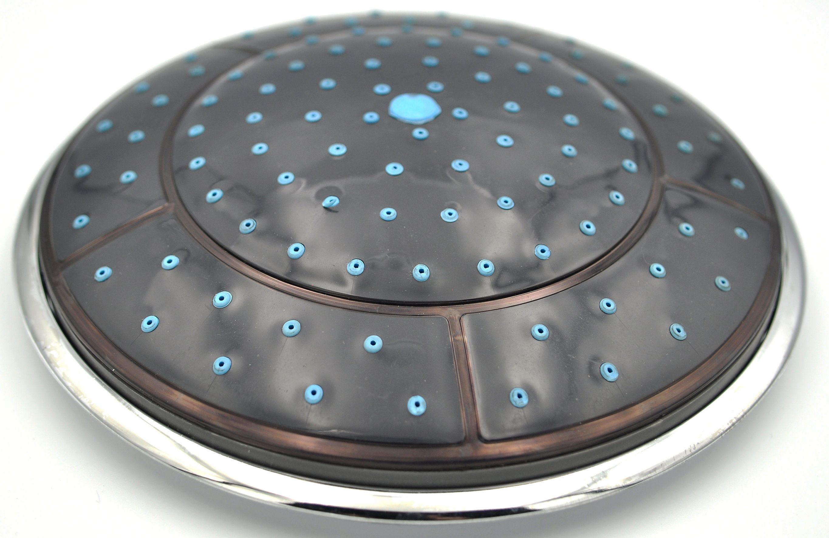 Fekete, kék pöttyös, króm szegéllyel. Külső átmérő: 24,5 cm (Íven mérve: 25 cm). Belső perem: 23 cm. Csomagolás része az esőztetőbe betekerhető csatlakozó szár. Csatlakozása: 1/2 coll. A forgalmazott termékek külső megjelenése és vastagsága kissé eltérhet. Utóbbi a beszerelhetőséget nem akadályozza!