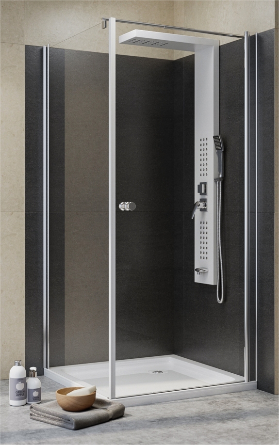 Szögletes zuhanykabin tálca nélkül 90x90x190cm 6mm-es edzett, víztiszta biztonsági üvegek. Polírozott alumínium profilok. Krómozott teleszkópos felső merevítő, mely bármely falra szerelhető. Emelőmechanikás ajtónyitás. Jobbos és balos szerelési lehetőség. Alumínium küszöb Szerelési méret: 88x88cm